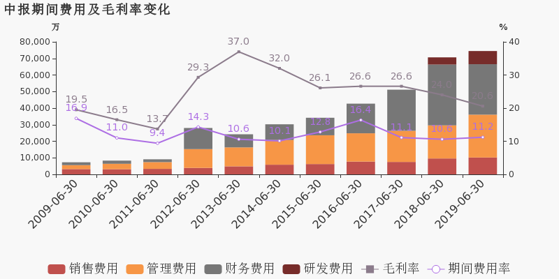 公司2019半年度营业成本53亿,同比增长4.9%,高于营业收入0.4%的增速,导致毛利率下降3.4%。期间费用率为11.2%,较上年升高0.5个百分点。经营性现金流大幅上升628.4%至4.5亿。