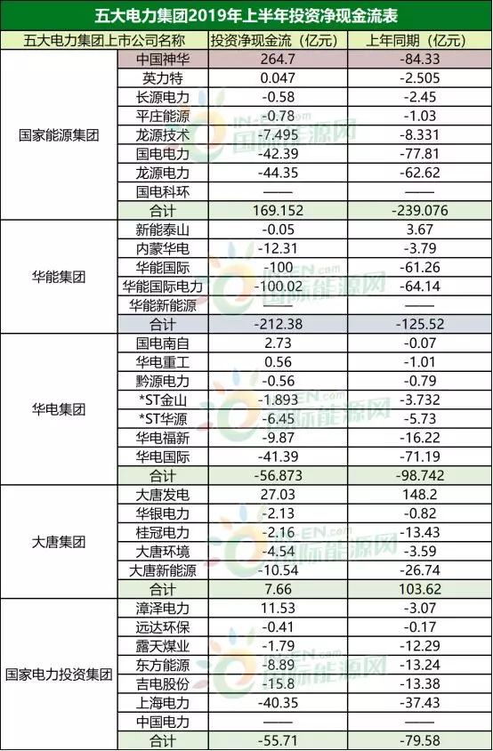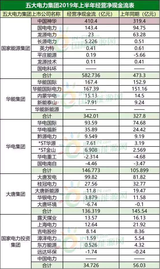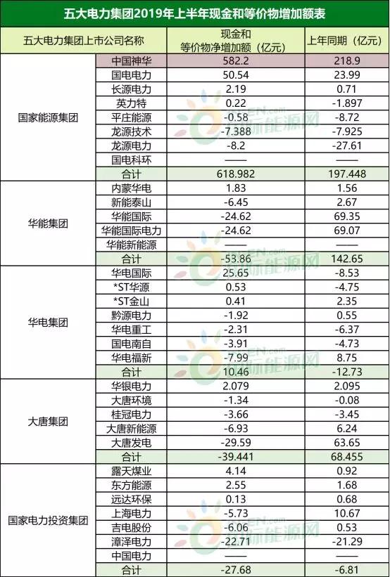 中国神华(19.610, 0.08, 0.41%)在今年上半年的现金和等价物增加值较去年同期实现了翻倍。在神华集团头部效应的带动下,整个国家能源集团的现金和等价物增加值翻了三倍以上。但是大唐集团、华能集团和国电投集团的现金和等价物增加值却是负数。而且三大集团较去年同期的数据相比出现了大幅下滑。说明三大集团有耗费资金的项目刚刚兴建,让集团整体的现金流减少。需要三大集团及时补充资金进入,防范金融风险。