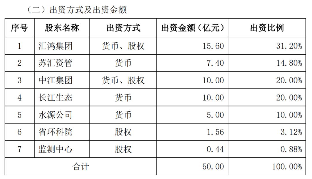 汇鸿集团(600981)20日晚公告,公司与江苏省国资委旗下苏汇资管、江苏国际经济技术合作集团有限公司、长江生态环保集团有限公司等七家投资方,拟共同成立江苏省环保集团有限公司(简称“省环保集团”)。省环保集团注册资本50亿元,公司拟出资15.6亿元,持股31.2%,为第一大股东;苏汇资管拟出资7.4亿元,持股14.8%。省环保集团实控人为江苏省政府,是政府生态环境重大基础设施的投资建设运营主体。