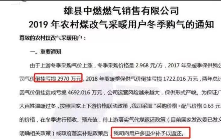 在雄安新区如此敏感的区域敢实施居民燃气限购,想来也是被逼的没办法了。 按照网传的雄县中燃燃气销售有限公司的一份通知称,由于上游冬季采购气价上涨,冬季采购价格是2.968元/方,2017年采暖季保供该公司气价倒挂亏损2970万元,2018年取暖季保供气价倒挂亏损1722.016万元,两年总计因气价倒挂造成亏损4692.016万元。