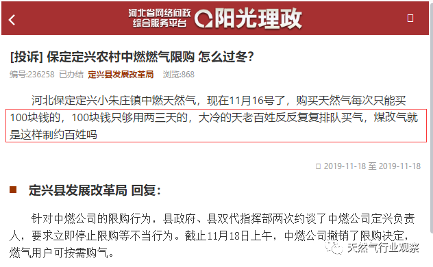 去年底推送的前文《人间不值得,轰轰烈烈的农村煤改气值得吗?曾经详述过大规模推进农村居民煤改气存在的一系列问题和隐患: 1、多煤少气的中国,巧妇难为无米之炊,大规模煤改气需进口大量价格昂贵的天然气,这些成本最终还是转嫁到老百姓身上; 2、城镇管道燃气这么多年发展过来,主要是解决了在城市人口密集、房屋密集、高楼密集的环境下能源安全廉价输送配送的问题。如果把城镇管道燃气整到农村,花几百万对一些零散的村落单独建设10公里、20公里燃气管道以及其他配套设施,但每年用个十多万方气,投资收益完全无法计算; 3、把城镇管道燃气整到农村,农村地区对于管道燃气的认识和安全意识相对薄弱,而同时用户分布更广,城燃企业难以按照城区配置合理的安全管理人员,可能直接导致农村管道燃气巨大安全风险; 4、天然气采暖生来就是奢侈品,在城区尚有很多居民无法承受天然气壁挂炉冬季采暖的成本,而要求远在农村经济条件相对较差承受力较低的居民以数千甚至上万的成本冬季采暖完全属于资源错配;  5、农村地区经济承受力有限,每户居民完成煤改气采暖设备加燃气管道安装费至少需支出8000元左右,1000万用户需支出800亿,当然通算下来,政府会承担一部分,但这部分补贴支出对于目前本来就负债累累的地方政府尤其是县级政府恐怕也是压力如山。再者,羊毛出在羊身上,政府开支同样来自纳税人; 6、天然气采暖自带“抢峰恶习”,造就储气调峰大问题,最终酿成历史性气荒惨剧。  一语成谶! 煤改气两年多过去,后续隐患及问题逐步显现,真的是人间不值得,居民煤改气更不值得! 这次限购的矛盾点在于上游气价上涨而搞煤改气的燃气企业又无法直接向煤改气用户顺价,不得不采取限购政策,以间接迫使居民少用气,企业少亏损。 前文《柏拉图《理想国》与中石油亏损的2300亿》提过中石油在今年3月制定的天然气销售2019年年度(2019年4月1日-2020年3月31日)调价方案大致为:淡季合同量内气价在门站基准价基础上上浮20%,旺季合同量内气价上浮20%到45%之间。 最终在各方的压力与反馈之下,上游虽然在淡季涨价上做出了一定让步。但非采暖季打折优惠了可不代表冬季继续打折,冬季得涨回来。上游与下游城燃公司已经签订的冬供协议中,其实已有部分气量涨幅超过30%,如果还不够就去交易中心竞拍。 上游不断的在涨价,如果城燃企业终端能够将上升的成本顺给用户的话,那还不会亏。 但如果顺不出去,对于一些工商业市场比较成熟的大型城燃企业而言还能够用工商业的价差对居民采暖气价进行一点交叉补贴,还得坚持一段时间。 而对于一些专门做农村煤改气的燃气企业而言,农村地区本身就缺乏工商业市场支撑,纯粹是居民用户,一旦居民用气无法顺价涨价,那么这些企业肯定会立马出现出现巨亏,类似于雄安中燃这种情况。 而国家发改委在前段时间答记者问时,明确要求“供暖季期间,各地不再调整居民用气终端销售价格。对居民用气“量价齐保”,居民用气门站价格不上浮。 不过按照前面雄安中燃的说法是,待上游落实气代煤返还政策(目前国家发改委已发文明确相关政策)或政府落实补贴政策后,该公司向用户多退少补予以返还。 也即是,上游气代煤返还政策以及地方政府补贴政策目前暂未落实,而上游气源采购费用是需要燃气公司实时结算的,居民用气不让涨,上游返还及政府补贴均未到位,燃气公司便承担了巨额的账面亏损以及巨大的现金流压力,这还不考虑这些返还和补贴是否能够完全覆盖气源倒挂的成本。 另外,其实,在煤改气气源供应方面,上游也是有苦难言的。 近年来,随着煤改气运动不断推进,国内天然气需求快速增长,上游单位每年需要大量采购国外管道气或LNG资源,由于居民门站价不让涨价,上游尤其是中石油每年承担了巨额的气源进口亏损。 发改委规定采暖期间,居民门站价不能涨价,上游别无他法,居民用气高昂的成本肯定会部分向非居用气传导,已建立上下游气价联动机制的燃气公司则将部分上涨成本传导至终端工商业用户。 部分居民用气的成本传导至非居工商业用户身上,实质上也是对本就风雨飘摇的实体经济撒了一把盐。 再看那些已经煤改气采暖的农村居民用户,其实日子也不好过。一方面天然气采暖本身就比原来的煤采暖成本要高不少,在经济上面临较大压力;另一方面还面临着采暖温度不足、燃气限购的困扰。 今年两会期间,便有人大代表提出国家及地方政府要对煤改气居民进行气价补贴,让农村居民能够用得起清洁采暖设施。 从地方政府角度来看,煤改气之后,同样面临巨大的居民用气补贴问题,这对很多财政本身已捉襟见肘的地方政府而言压力山大,这也是目前很多地方煤改气补贴迟迟不能落实的原因。 这个改革政策出发点是何其的好,可最后终于还是出现了去年就预计到的一个任何一方均不满意的困局: 政府贴不起、上游供不起、城燃卖不起、农民用不起!