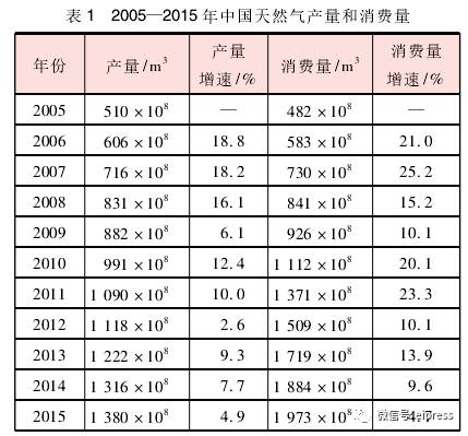 近年来,由于节能减排和大气治理的需要,中国积极调整能源结构,推广清洁能源,2005—2015年中国天然气产量和消费量见表1,可以看出近10年天然气勘探开发和消费量保持快速增长。