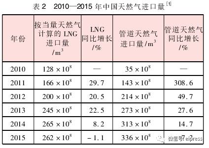 依据《BP世界能源统计年鉴》,2010—2015年中国天然气进口量见表2。