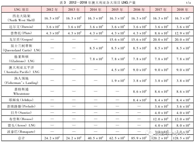 结合未来几年即将投产的各大LNG项目的产量来看,预计其LNG出口量将会在2015—2020年期间年均增长32.5% ,但是其电力、工业和居民及商业消费量分别年均减少16.6% 、2.3%和0.1%。虽然澳大利亚国内天然气总体消费量在2014年开始出现了下降的情况,但2016年澳大利亚业内对天然气消费量的预期较2014年乐观,认为澳大利亚国内天然气消费量将在5年内止跌,并在未来长期( 2020—2035年) 稳步增长。2012—2018 年澳大利亚各大项目LNG产量见表3。