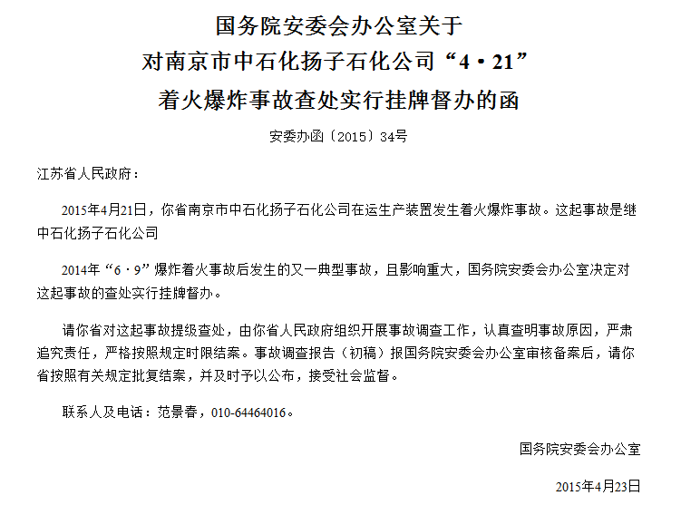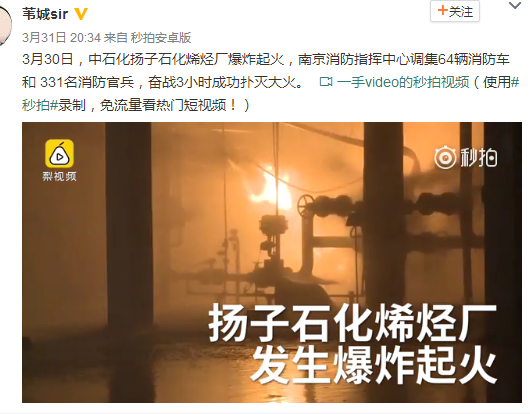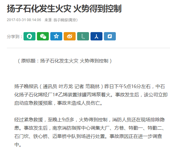 2017年30日下午17时16分左右,中石化扬子石化烯烃厂1#乙烯装置球罐丙烯泵泄露着火。事故发生后,该公司立即启动应急救援预案,装置紧急停车,据南京发布最新通报,经消防官兵全力扑救,扬子石化烯烃厂事故现场明火已于20时45分扑灭,经确认,事故未造成人员伤亡。消防水全部收集至企业事故池内,大气环境检测正常,相关后续处置工作正在进行。