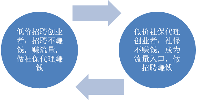 靠,社保代理领域互联网创业者也这样:“我社保代理低价近乎免费,是为了形成入口,获得流量,然后再做招聘,在招聘上赚钱”!
