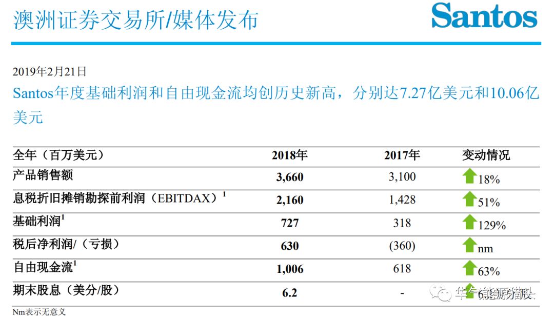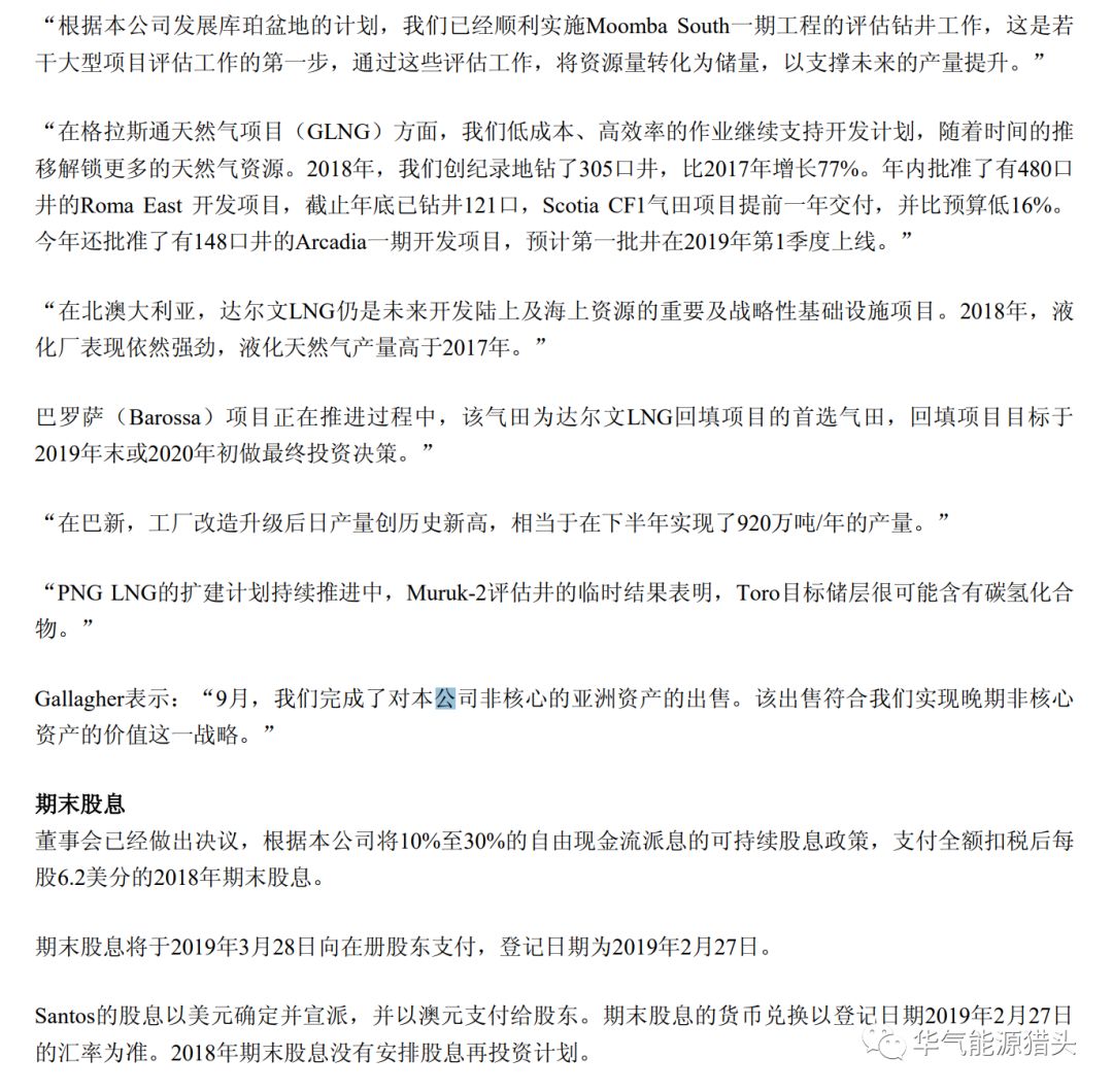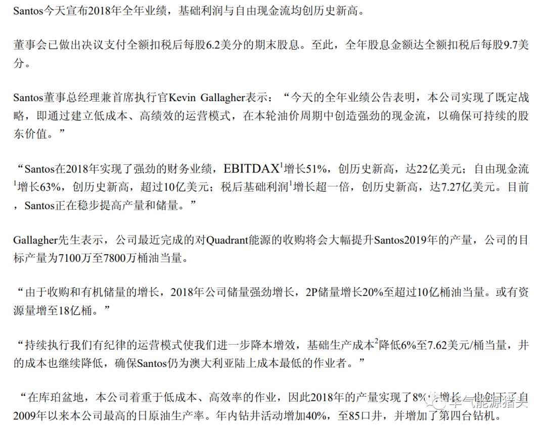 1、本公告中关于 Santos 2018 年年度报告的主要内容摘自《Santos 2018 年 度报告公告》。