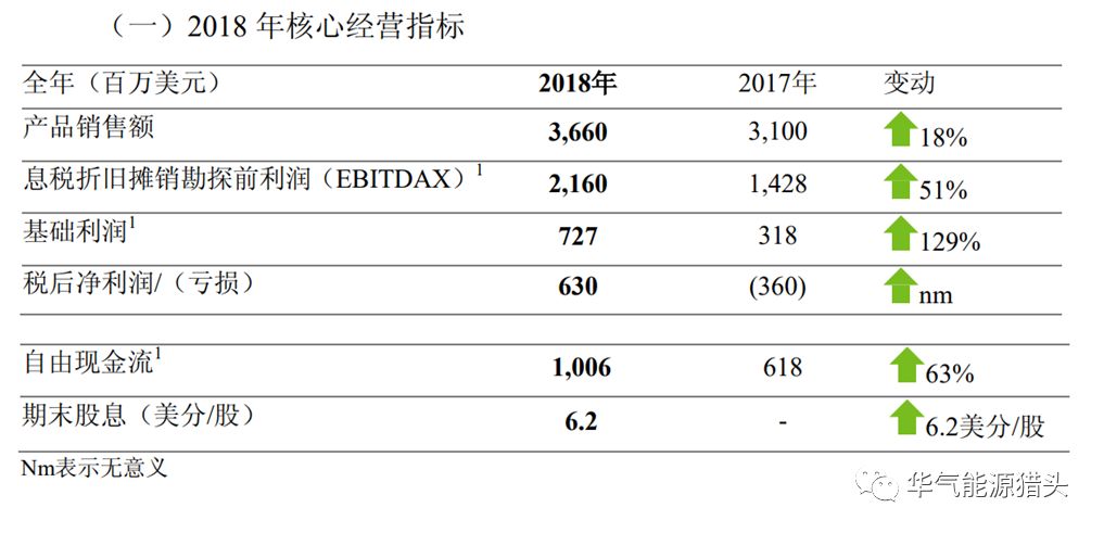 Santos 2018 年实现息税折旧摊销勘探前利润(EBITDAX)1 21.6 亿美元, 同比增长 51%;实现自由现金流 1 10.06 亿美元,同比增长 63%;Santos 持续执 行其运营模式进一步降本增效,2018 年基础生产成本(不包括停工影响)7.62 美元/桶当量,同比降低 6%,钻井的成本也继续降低;实现税后基础利润 1 7.27 亿美元,同比增长 129%,税后净利润为 6.30 亿美元。