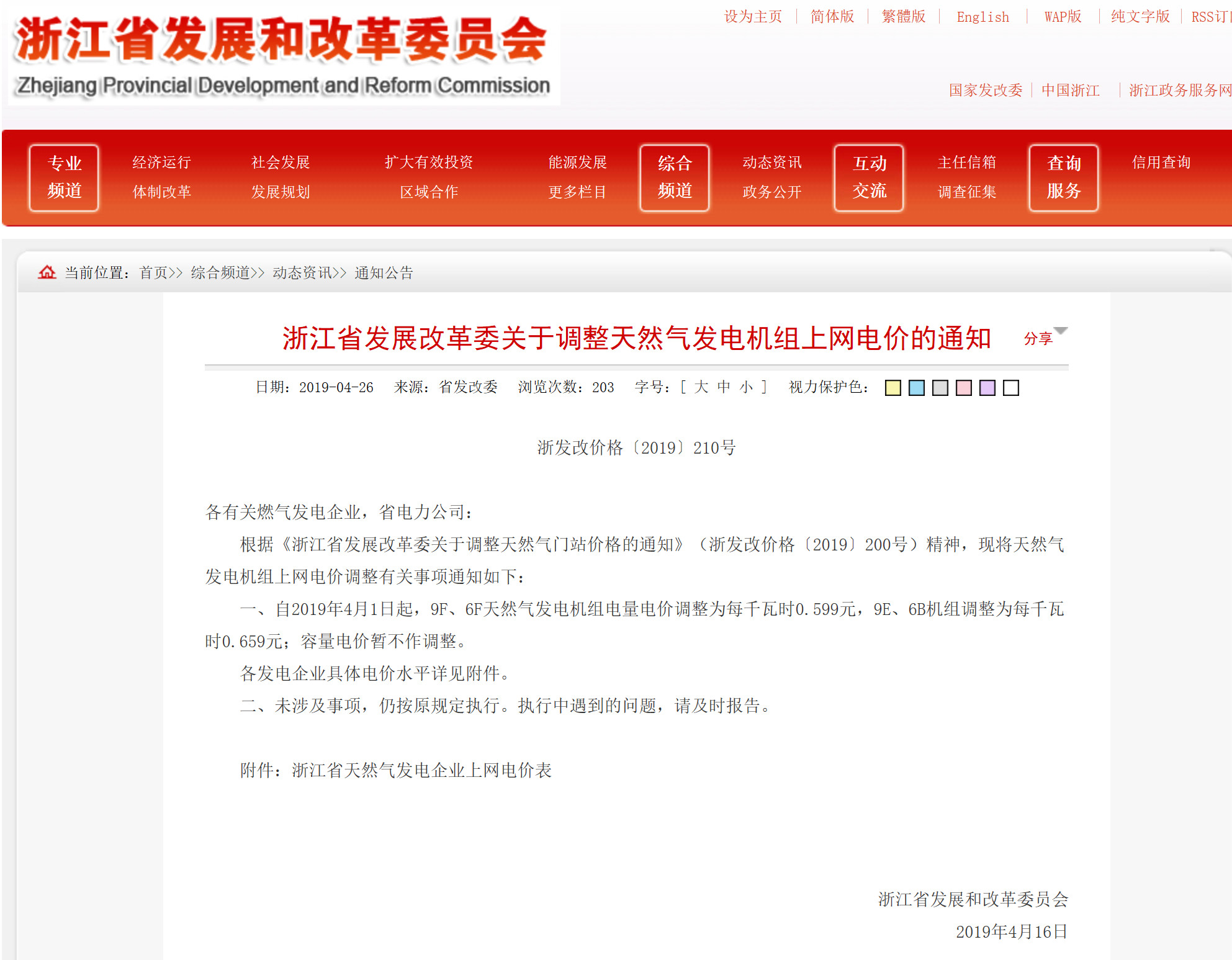 根据《浙江省发展改革委关于调整天然气门站价格的通知》(浙发改价格〔2019〕200号)精神,现将天然气发电机组上网电价调整有关事项通知如下: