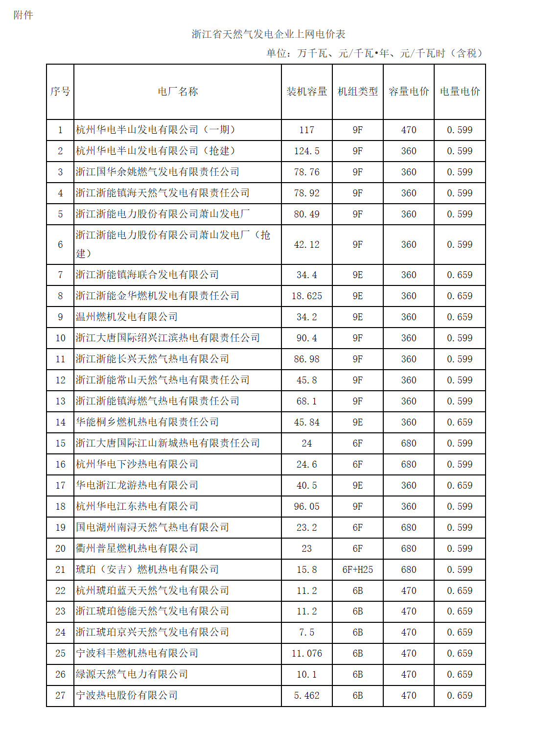 附件:浙江省天然气发电企业上网电价表