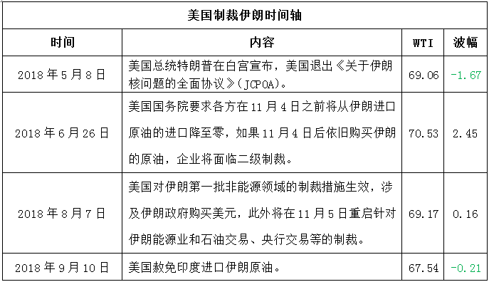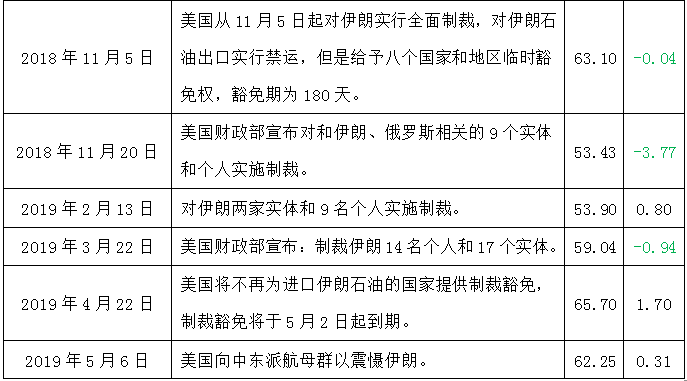 美国自2018年5月8日宣布退出伊核协议以来,接二连三地向伊朗发难,但同时三令五申地呼吁低油价,因此对国际油价也提出了极大的考验。从此次美国制裁伊朗的时间轴来看,国际油价共出现了4次较大的单日波动(当日波动≥±1.5美元/桶),分别是2018年5月8日、6月26日、11月20日和2019年4月22日(见下表)。
