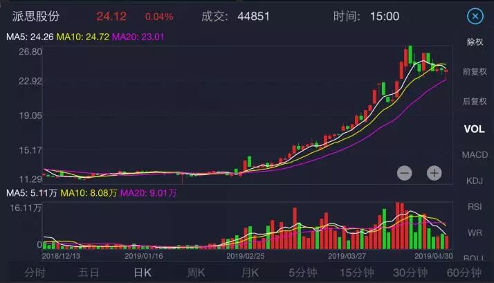 中国股市就是如此神奇,业绩不利不影响股市飙升,派思股份从2019年1月4日的12.5元一路上涨翻倍,至2019年4月19日最高达到26.8元。