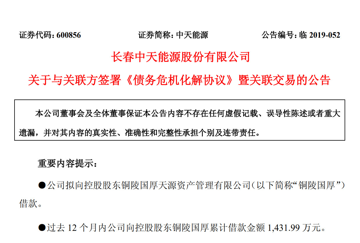 原标题:中天能源:与控股股东签署债务危机化解协议