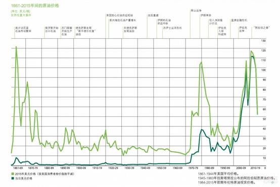 1861-2015年间的原油价格变化趋势 来源:《BP世界能源统计年鉴》2016版