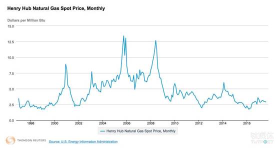 1997年至今的美国天然气价格变化趋势 来源:美国能源信息署