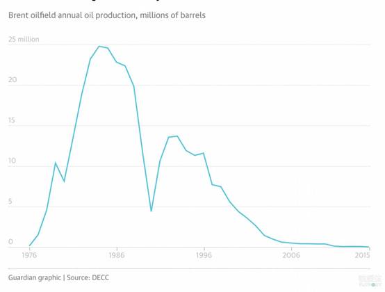 布伦特油田产量在80年代之后持续下滑 来源:《卫报》