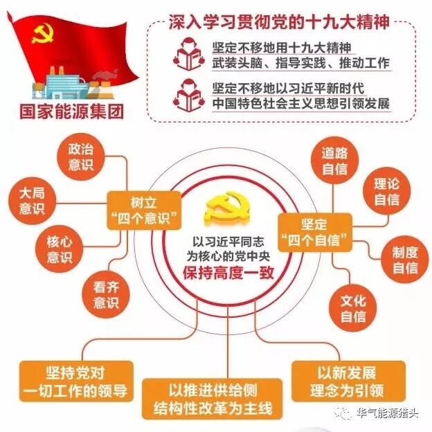 国家能源集团将深入学习贯彻党的十九大精神,坚定不移地用十九大精神武装头脑、指导实践、推动工作,坚定不移地以习近平新时代中国特色社会主义思想引领发展,牢固树立“四个意识”,坚定“四个自信”,坚决在思想上政治上行动上同以习近平同志为核心的党中央保持高度一致,做到党中央提倡的坚决响应,党中央决定的坚决执行,党中央禁止的坚决不做,坚持党对一切工作的领导,以新发展理念为引领,以推进供给侧结构性改革为主线,聚焦煤炭、发电主业,大力实施“三去一降一补”,化解产能过剩,优化布局结构,推进绿色发展,大力实施创新驱动战略,全面深化内部改革,加快完善现代企业制度,积极发展混合所有制经济,加大“走出去”力度,积极参与“一带一路”建设,全力打造具有全球竞争力的世界一流综合能源集团,坚定不移地做强做优做大国有企业,更好地发挥国家能源供应“稳定器”和“压舱石”的作用,坚决履行好中央企业肩负的重大经济、政治和社会责任,成为党和国家的“六个重要力量”。