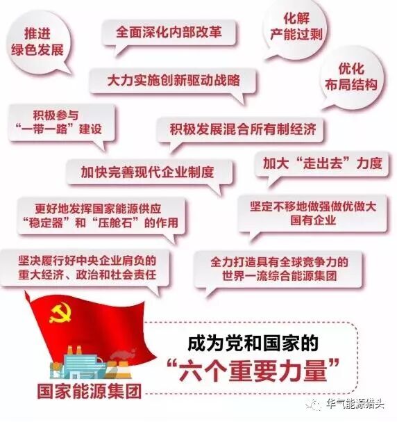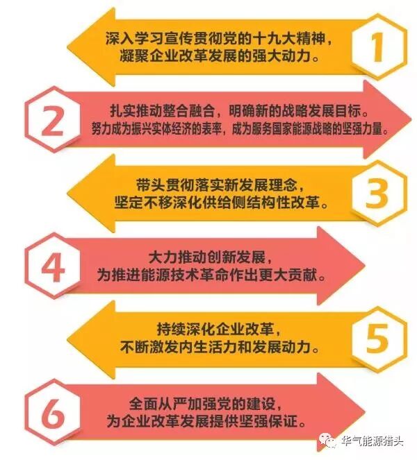 一要深入学习宣传贯彻党的十九大精神,凝聚企业改革发展的强大动力。二要扎实推动整合融合,明确新的战略发展目标。努力成为振兴实体经济的表率,成为服务国家能源战略的坚强力量。三要带头贯彻落实新发展理念,坚定不移深化供给侧结构性改革。四要大力推动创新发展,为推进能源技术革命作出更大贡献。五要持续深化企业改革,不断激发内生活力和发展动力。六要全面从严加强党的建设,为企业改革发展提供坚强保证。