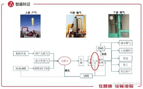 天然气的产业链分为上中下游,上游就是油气开发,代表企业有中石油、中石化,或者进口油气;中游即油气运输,是从油气源头到城市这段距离,代表企业依然是三桶油;下游指天然气分销,是指将中游传导过来的天然气分销到千家万户,代表企业有中国燃气、华润燃气等等。