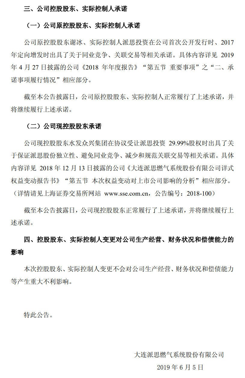 附:大连派思燃气系统股份有限公司 关于控股股东、实际控制人发生变更的提示性公告