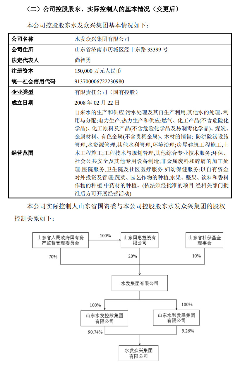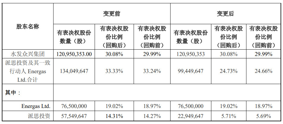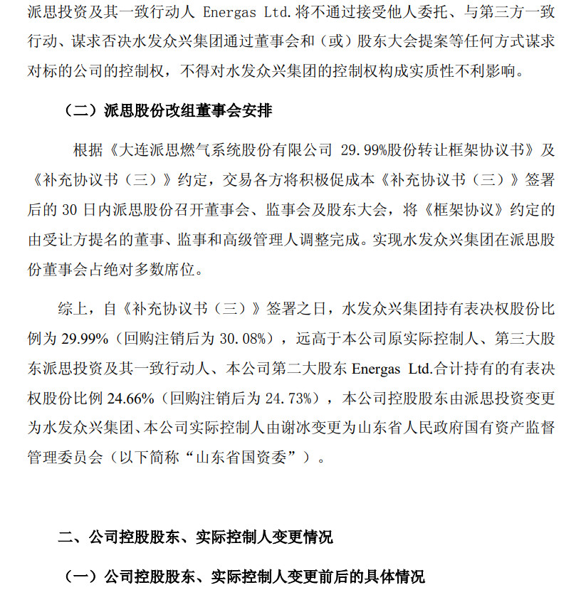 自协议签署之日,水发众兴集团持有表决权股份比例为29.99%(回购注销后为30.08%),远高于公司原实际控制人、第三大股东派思投资及其一致行动人、公司第二大股东Energas Ltd.合计持有的有表决权股份比例24.66%(回购注销后为24.73%);至此,公司控股股东由派思投资变更为水发众兴集团、公司实际控制人由谢冰变更为“山东省国资委”。