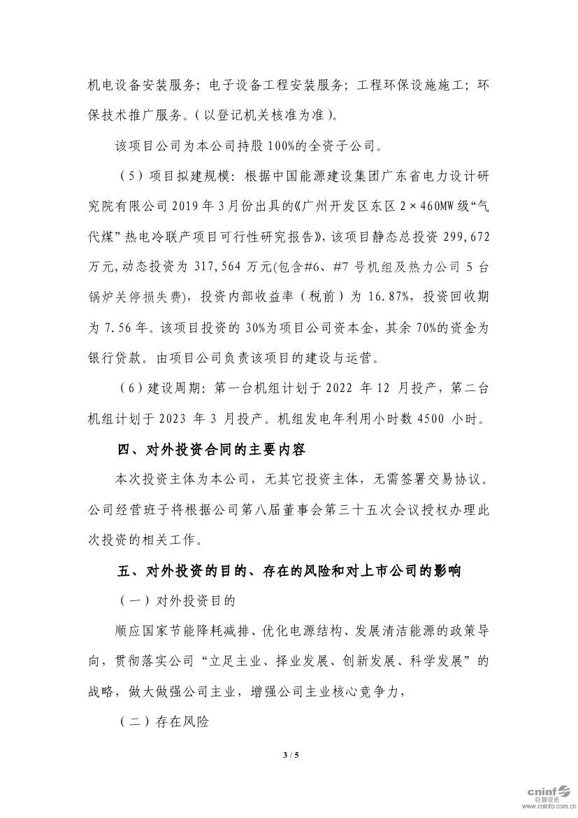项目拟建规模:根据中国能源建设集团广东省电力设计研究院有限公司2019年3月份出具的《广州开发区东区2×460MW级“气代煤”热电冷联产项目可行性研究报告》,该项目静态总投资299,672万元,动态投资为317,564万元。