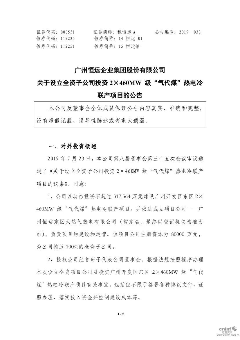 附:广州恒运企业集团股份有限公司 关于设立全资子公司投资 2×460MW 级“气代煤”热电冷 联产项目的公告 公告链接:http://notice.10jqka.com.cn/api/pdf/d085295109cb6a30.pdf