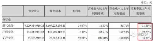 年报显示,2018年金鸿控股三大业务毛利率均有较大幅度下降,燃气业务、环保业务、矿产业务毛利率分别下降11.81%、19.23%、6.33%,果不其然,在对深交所的问询函回复中金鸿控股解释称,全年天然气采购价格上升18.69%,远超天然气销售价格上升幅度8.71%,导致毛利率下降,在于同行业公司比较时,金鸿控股也是毛利率下降最明显的公司。