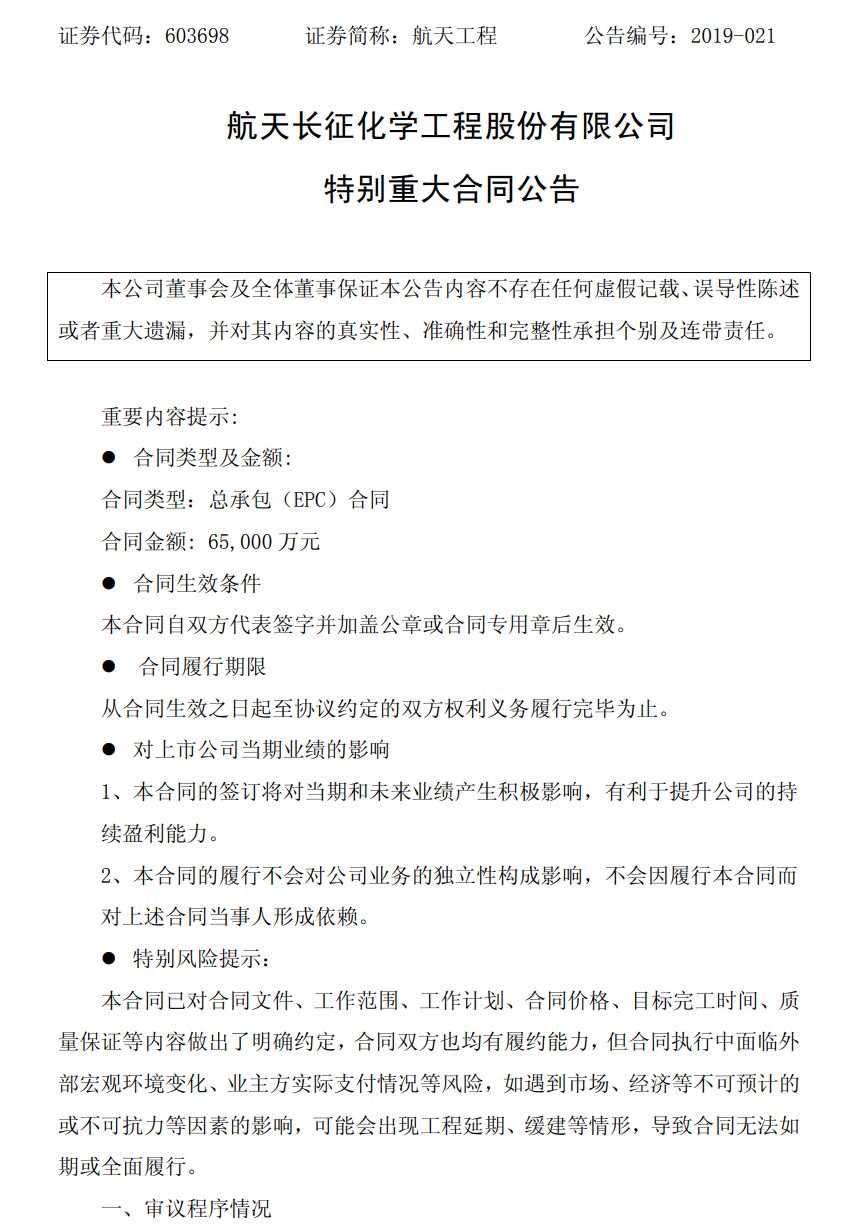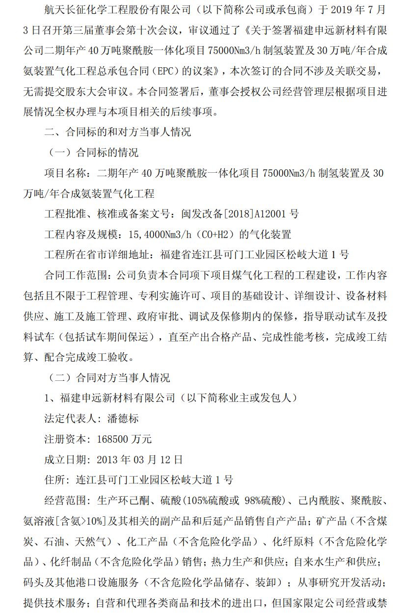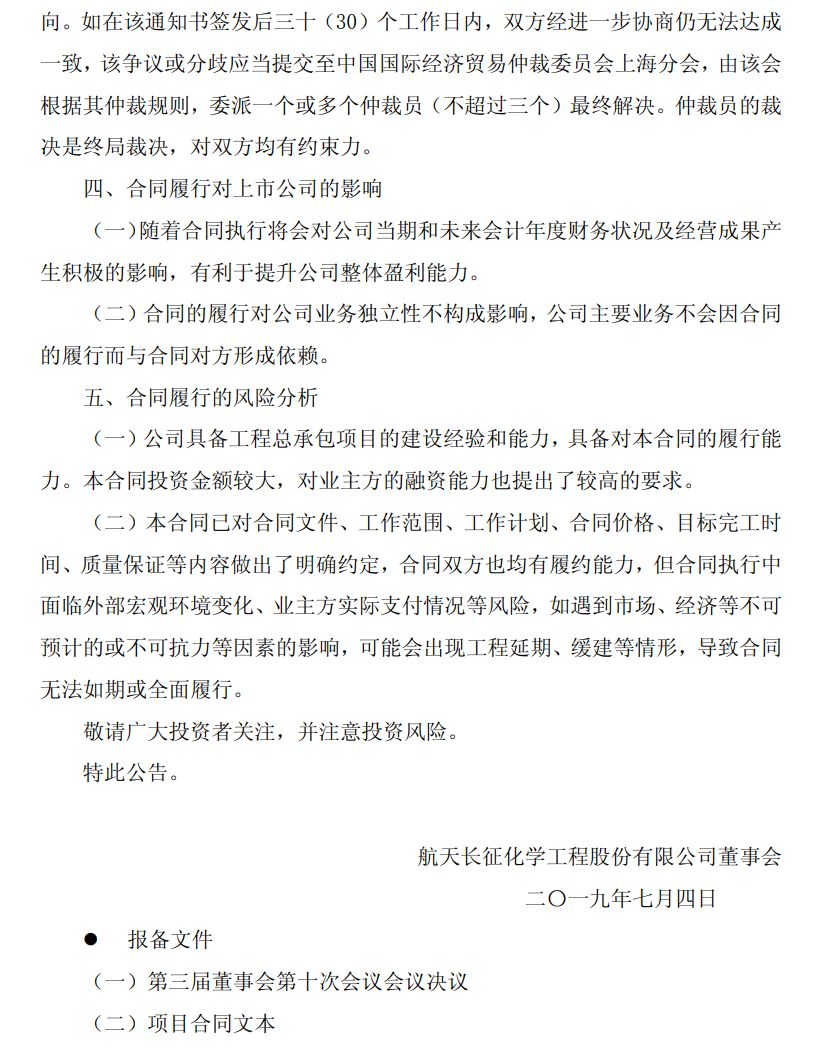 附:航天长征化学工程股份有限公司 特别重大合同公告