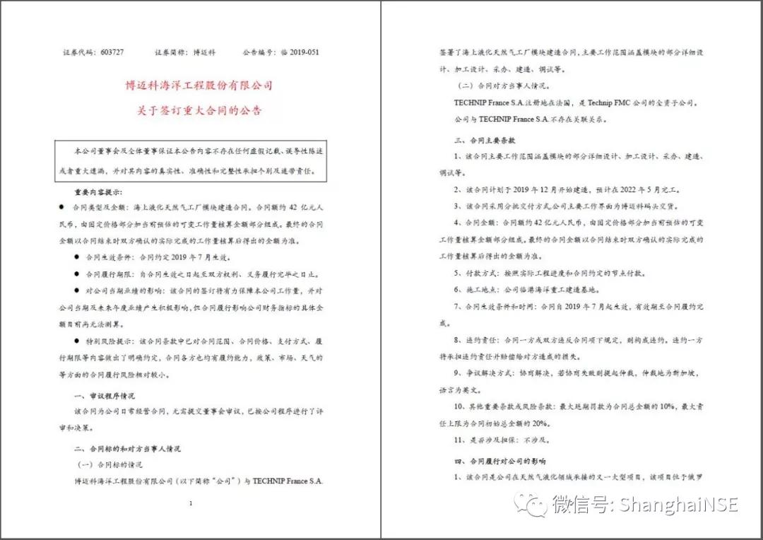 博迈科公告披露,公司与TECHNIP France S.A. (德希尼布 法国)签署了Arctic LNG 2项目海上液化天然气工厂模块建造合同,主要工作范围涵盖模块的部分详细设计、加工设计、采办、建造、调试等,合同额约42亿元人民币。计划于2019年12月开始建造,预计2022年5月完工。
