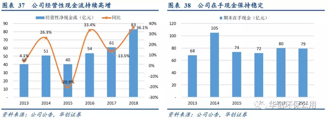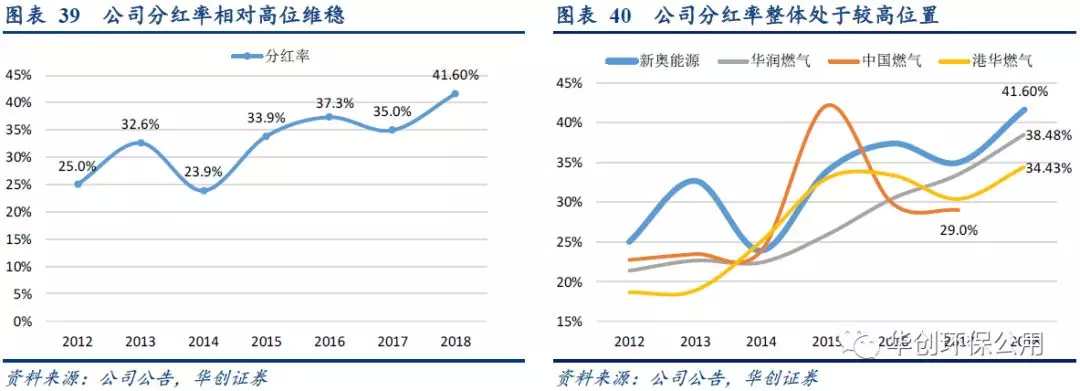 公司近年资本支出主要用于燃气相关设备的购置且金额不大,而在不断扩张的城燃业务拉动下公司现金流保持良好,2018年末公司经营性净现金流82.94亿元,同比增长36.1%;期末在手现金79.2亿元,基本保持稳定。同时公司近年分红率整体保持上升,2018年实现派息率41.6%。