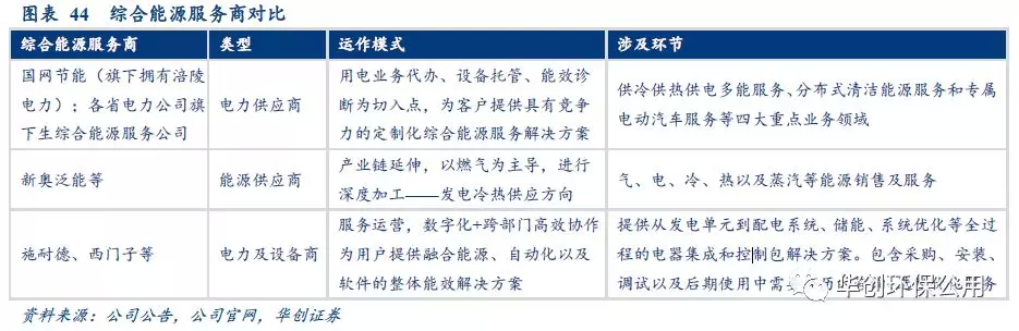 目前市场上的综合能源服务商主要有国网旗下的综合能源服务公司、以西门子、施耐德等为代表的传统电力及设备商、节能服务商和以新奥泛能为代表的能源服务商。由于综合能源服务的三大环节能源、设备和运维中,设备商拥有设备优势,但仍需要与能源企业进行供能的合作与谈判,整体来看对上游议价能力相对不强。运维商则主要通过系统升级、用能端改造等方式提升运维效率,但其更多的是在系统层面进行支持,其定位类似于咨询公司,垂直整合资源能力较弱。而能源供应商的节能角度更多是从整体的用能规划角度来提升能源使用效率,其整合能源服务的先天优势更有利于统筹规划和效率提升。