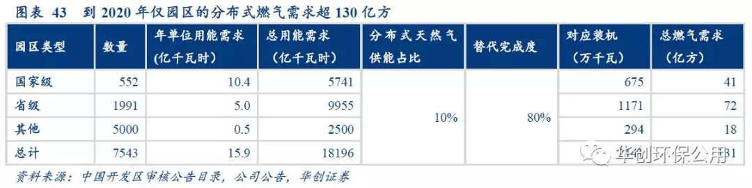 综合能源服务的对象一般是常年有供电、供热、制冷等稳定需求的工业园区和公共用户(如机场、医院、商场、数据中心等)。由于公共用户规模和发展程度差异较大,若仅考虑需求相对稳定的工业园区及开发区,2018年国家级、省级各类开发区2543个,参考新奥能源国家级余杭园区项目每年约10.4亿千瓦时的总用能规模,以及《关于推进多能互补集成优化示范工程建设的实施意见》中明确的“2020年30%的能源综合梯级利用改造比例和新建园区50%终端一体化集成供能系统”,假设当前80%园区达到30%的能源梯级利用且天然气分布式占比30%,仅园区天然气分布式的装机规模将达2141万千瓦,对应天然气需求量超130亿方,而对比2016年底天然气分布式1200万千瓦的装机规模,并考虑到综合能源服务还囊括了其他公共用户及各类清洁能源及服务系统,整体市场规模仍有巨大提升空间。