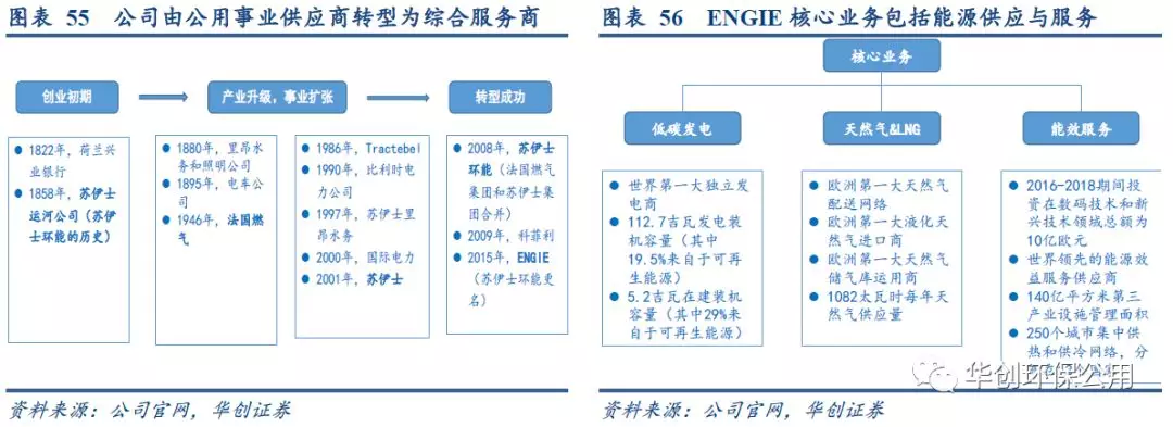 ENGIE是全球领军的能源服务商,其前身是多家历史悠久的公用事业和工业企业,通过一系列并购和业务革新不断转型并成为当前覆盖70余个国家的跨国能源服务商。上世纪90年代初欧洲能源市场的放松管制促进了法国燃气公司和苏伊士公司的国际发展,使它们的活动逐步扩大到欧洲和国际上各自的传统市场以外,并于2008年7月22日合并为苏伊士环能集团。2015年4月24日,苏伊士环能正式更名为ENGIE,核心业务包括低碳发电、天然气销售和能源服务。