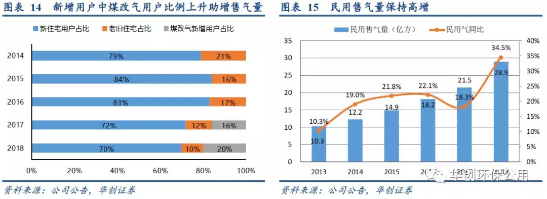 煤改气推进+城镇化共助民用气量提升。2017年煤改气推行以来,公司煤改气新增用户的占比有所提升。2018年民用售气量同比大幅增长34.3%至28.9亿方。