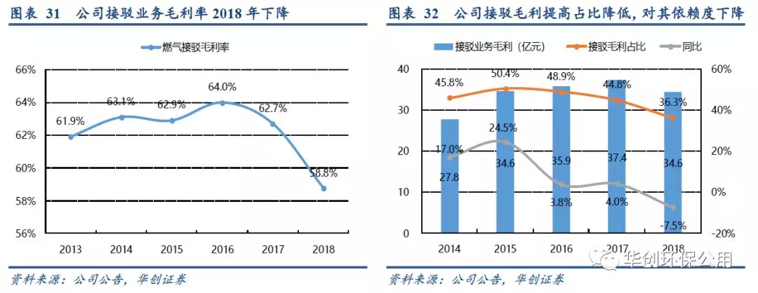 考虑到公司主要项目地区的工业煤改气仍持续推进,预计工商业2019、2020年设计供气能力同比增长16.0%、13.5%,而居民用户接驳增速在2020年煤改气窗口期结束后放缓,2019、2020年接驳户数同比增长12%、10%。价格方面,工商业接驳均价相对维稳,民用接驳价格在工程安装费政策的导向下,我们保守预计含税价格下降至2400元以下,预计2019、2020年接驳总收入预计同比减少3.6%、6.1%至57亿、53亿元。工程安装毛利率下降至约57%的水平。