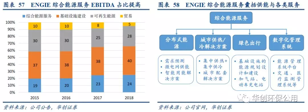 ENGIE由供应商到服务商的转型为当前国内公用事业企业提供了发展的参考方向。ENGIE在早期作为天然气分销商,其天然气销售业务在法国燃气集团作为天然气的分销商,虽然手握部分气源和终端渠道,但随着燃气普及率的提升和上游气源企业向下游的渗透,燃气分销业务的发展空间受到挤压,因此公司通过战略转型,剥除传统的LNG销售业务,并积极进行国际收购和跨领域收购,使综合能源服务等成为持续增长的驱动因素。