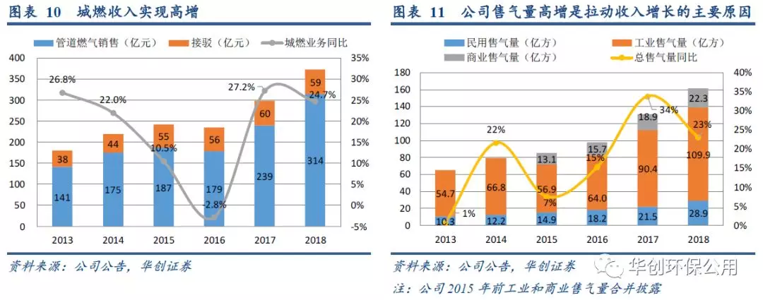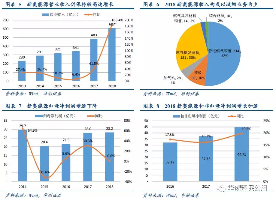 公司的营业收入主要由城燃分销、接驳、加气站、燃气批发综合能源销售及服务、材料销售、燃气具销售六部分组成。2018收入年高速增长25.8%至607亿元,其中城市燃气业务占比52%仍是拉动收入增长的最重要力量,另外贸易业务受益于2018年天然气行业的量价齐升占比提升至30%,而综合能源服务业务在低基数下实现3倍以上增长,2018年收入占比约2%;2018年归母净利润虽受可转债和商品对冲工具公允价值变动损益、汇兑损益等一次性影响同比基本持平,但是反映核心业务的扣非归母净利润增长加速,较2017年增长19.8%至44.71亿元。