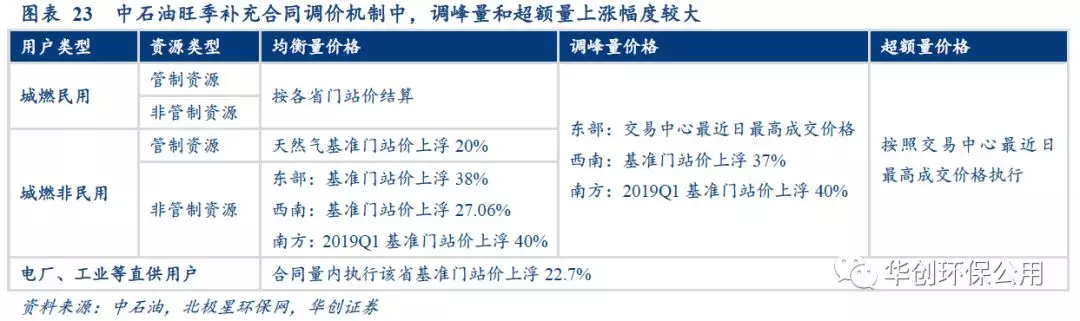 2018年在民用保供压力下,中石油在与下游签订2018年冬季天然气保供合同时,对东部、西南和南方地区的用气量在基准门站价的基础上浮20%-40%,其中非民用的调峰用气涨价幅度较大。我们以公司披露的各地区天然气用户数量和户均售气量测算,2018-2019供暖季中石油涨价拉低的毛差约为0.050元/方。