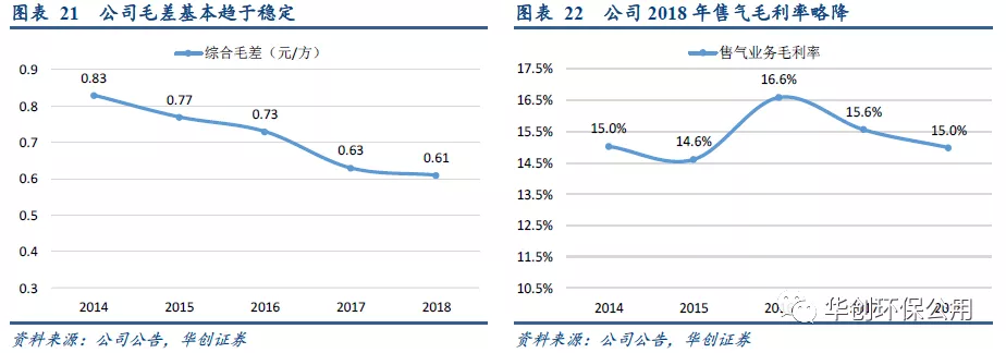 工商业售气量在煤改气和现有项目周边积极拓展的驱动下实现约24%的售气量增长,2019年门站价上浮的顺价情况较好,加之接收站的增量气贡献,综合毛差在2018年低基数的基础上维稳在0.63元/方左右,而2020年随着民用保供压力的进一步减小,工商业仍具有扩张动力,预计售气量增速仍保持20%以上,毛差基本维稳,2019-2020毛利率基本维持20%以下水平。