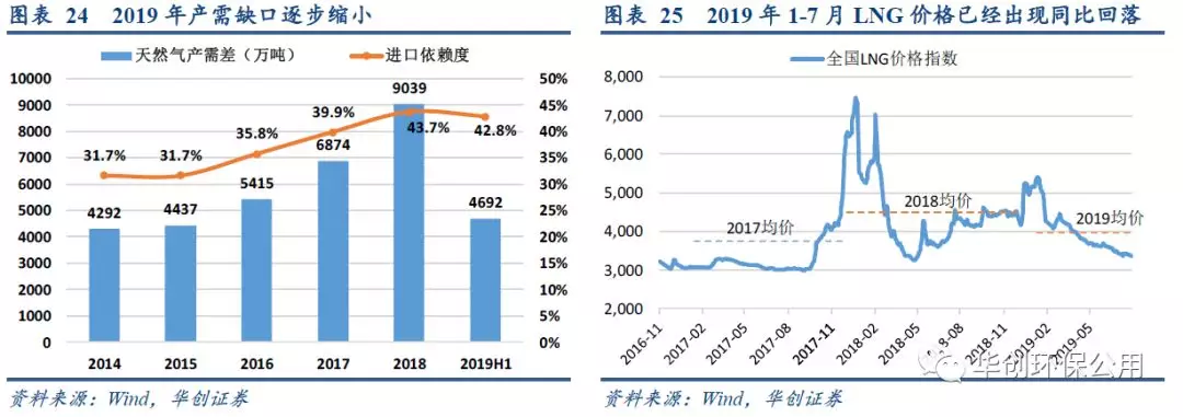而2019年以来,供需格局进一步好转,2019H1产需缺口显著缩小,进口依赖度在持续上升后首次出现下降,同时截至7月的LNG价格的同比下降也一定程度上反映了市场供需同比向宽松方向发展,因此预计2019年旺季中石油对门站价的上浮力度有所减小,同时在管网假设推进的背景下,气源拓宽下企业对合同外额外气的依赖程度也有望降低。