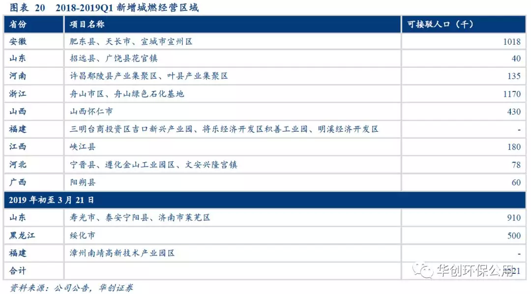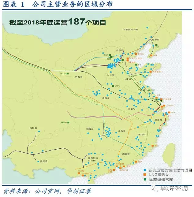 公司燃气项目主要分布在福建、河北、山东、河南、湖南、江苏等煤改气重点地区和东部发达地区。受益住宅用户和工商业用户需求拉动,公司近年特许经营权覆盖范围的扩大,2018年公司共收购了 23个新项目及 34个现有项目外围的经营区域,项目总量达187个,覆盖可接驳人口达9457万人。扩张项目中既有现有强势区域如河北、湖南、山东等,也包含了部分项目规模相对较小的区域,一方面乘现有管网的协同效应,降低了扩张的成本,另一方面随着规模的提升,对周边区域上下游的议价能力也有望进一步增强。