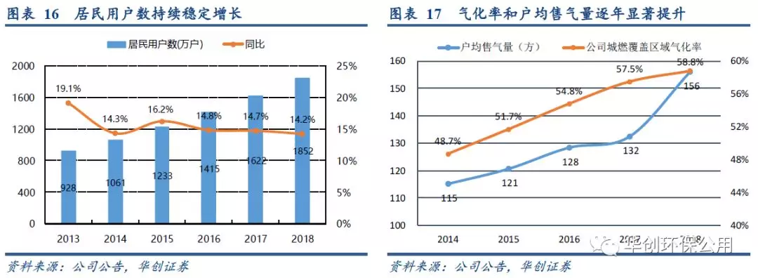 户均售气量提升利好长期发展。2018年天然气居民用户同比14.3%至1852万户,售气量增速远高于用户数增长,户均售气量同比提升而当年民用售气量增速达34.3%至28.9亿方,户均燃气销售量近年均保持提升。在用户数和户均消费量双提升的拉动下,公司2018年末覆盖区域气化率同比进一步提升1.3pct至58.8%。