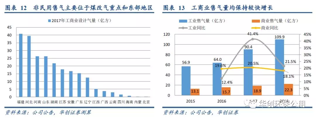 公司工商业城燃项目同样位于燃气需求旺盛的重点区域,售气量占城燃分销售气总量八成以上,而其中工业售气量又占工商业售气量的80%以上,是售气量和收入的拉动主力。2017、2018工业售气量分别同比增长41.3%、21.6%至90亿和110亿方;商业售气量分别同比增长20.4%、18.1%至18.9亿、22.3亿方。